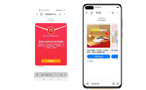 智能消息是通過手機終端信息增強技術,將傳統文本短信無縫升級為可交互的富媒體信息,目前智能消息可以適配的手機品牌主要有華為、小米、oppo、vivo等,支持智能消息的機型直接顯示為智能消息(右圖),不支持智能消息的機型直接顯示為文本短信(左圖)